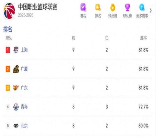 首先我们可以关注到目前排在前五名的分别是上海、广厦、广东、青岛以及北京队。这样的一个排名和赛季初的排名应该是差距非常大的。因为我们知道一开始的时候,北京男篮是长期占据榜首,而广东男篮则是排在前两名,有的时候也能够挤掉北京队排在榜首。但经过了目前差不多十场比赛的争夺之后,现在整个竞争格局发生了非常大的变化。