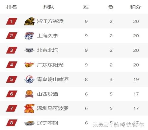 积分榜第9名则属于宁波队,作为本赛季第一黑马,宁波队新赛季的状态非常不错,这一场比赛他们虽然遗憾输给了北京队,不过,他们却打出了球队该有的气质。截止到目前,他们的战绩是6胜5负,依旧保持着冲击八强的可能。排在宁波队身后的是广州队,他们在这一轮比赛掀翻了新疆队,成功拿到赛季第6胜,球队目前的战绩是6胜4负,在少赛一轮的情况下,他们还能稳居积分榜第10名,这已经实属不易了。