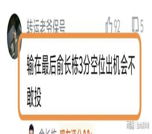 许多球迷质疑俞长栋的空位不敢投。“还剩30多秒,俞长栋出来机会投了回来还有一次进攻机会。然而愣是原地空位等着给了外援,投不进,只能犯规!”;“输在最后俞长栋3分空位出机会不敢投。”;“俞长栋真是牛,空位都不投。”……