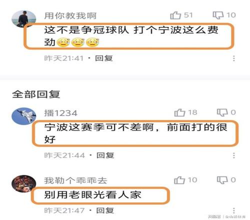 宁波队虽然输球,但却赢得了众多球迷的赞誉。“宁波这赛季可不差啊,前面打的很好”;“别用老眼光看人家”;“宁波能跟目标是争冠的球队打成这样真的不错了,这赛季能进季后赛吧”;“咱就说宁波强不强吧”;“战绩在那,加油。”。“宁波今年打通任督二脉了?”……