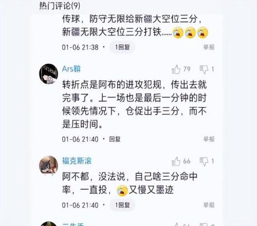 球迷说,“看到沙拉木投三分就紧张”、“这场队长确实打的不好,但凡进一个三分都不一样”、“阿不都沙拉木,没法说,自己啥三分命中率,一直投,又慢又墨迹”、“这场沙拉木打的垃圾,特么莫名其妙的失误,投三分啥玩意乱七八糟”,球迷叹息:沙拉木打的一坨屎!