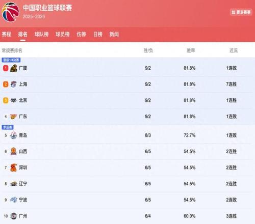 CBA排名有变:广东掉第4,厦沪京前3辽宁追至第8,11连败球队诞生