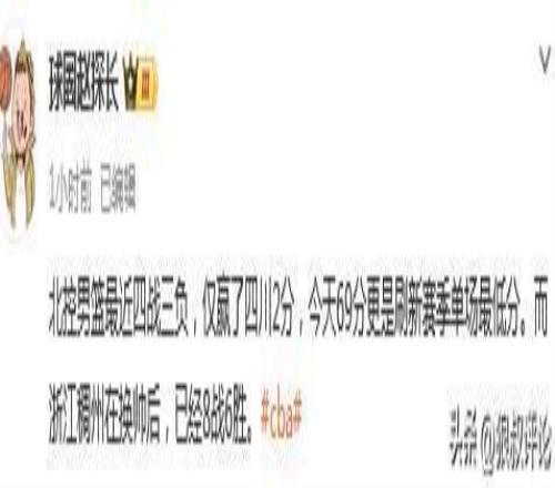 媒体人球圈赵探长发文点评:北控男篮最近四战三负,仅赢了四川2分,今天69分更是刷新赛季单场最低分。而浙江稠州在换帅后,已经8战6胜。