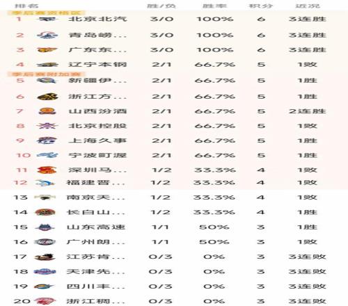 CBA第3轮排名:北京第1,广东第3,广厦第6,上海第9,浙江仅第20