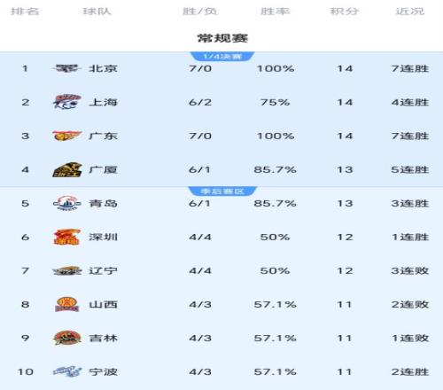最新积分榜排名,深圳队反超辽宁队,升至第六位。