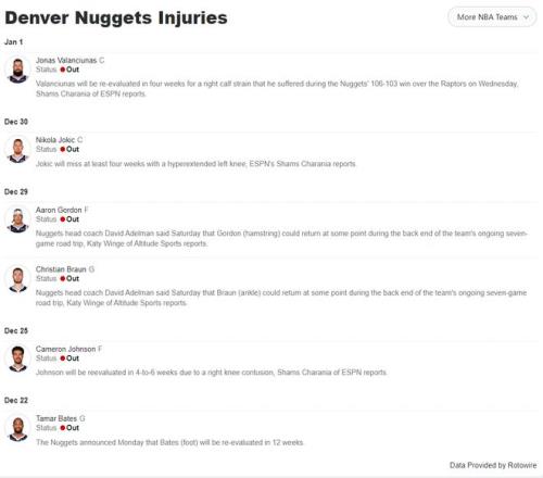 掘金非常之惨,先发的约基奇、戈登、卡梅伦-约翰逊、布劳恩都伤了,替补的中锋瓦兰也伤了,换言之核心轮换伤了5人,小阿德尔曼不得不摆出穆雷、沃特森、斯潘塞-琼斯、霍姆斯、皮克特的先发阵容,这套阵容有把握的实际上只有穆雷一人。