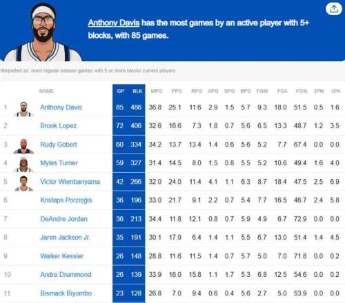 内线真神,浓眉对火箭单场送5盖帽,现役球员5+盖帽场次第一