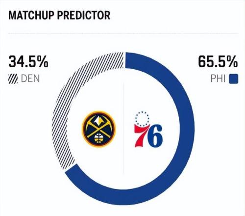 赛前,美媒ESPN对本场比赛进行了胜率预测,残阵掘金队胜率仅有34.5%,劣势明显,76人的胜率则高达65.5%。