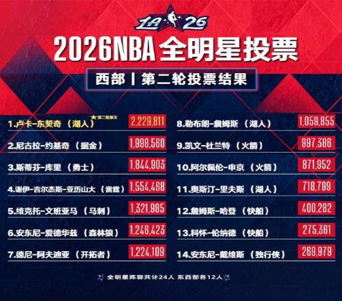 北京时间1月7日,NBA官方公布了2026年NBA全明星第二轮球迷投票结果,洛杉矶湖人后卫卢卡·东契奇与密尔沃基雄鹿前锋扬尼斯·安特托昆博,分别继续领跑西部和东部。东契奇为第二轮票王,詹姆斯位居西部第八。
