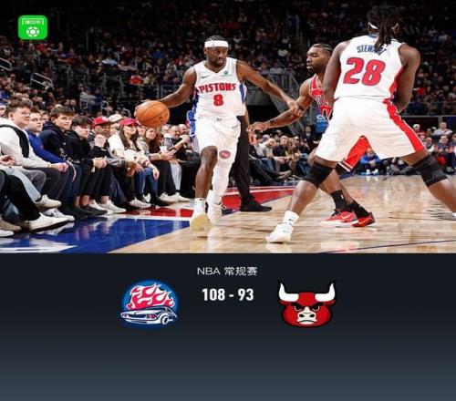 第四节活塞查兹-拉尼尔拿下8分,公牛武切维奇拿下5分,最终活塞108-93战胜公牛