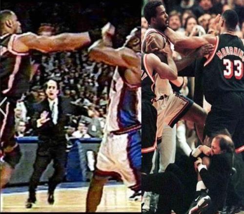 不曾想,莫宁和约翰逊素有仇怨,二人之间的仇怨发展到后来,就成了尼克斯和热火世仇的组成部分。1997年,热火占了便宜,查理-沃德和PJ-布朗之间的抱摔,拉开了这段世仇的大幕,热火以4-3翻盘尼克斯。但此后,尼克斯见热火一次就灭一次,包括1999年的黑八奇迹,一路“黑”到总决赛。这期间,杰夫-范甘迪在两队球员大打出手时,抱住莫宁的大腿一幕,成为NBA的经典一幕。