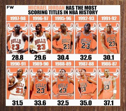 所以,我们一直很想知道,如果乔丹没有在93年、98年两次巅峰退役,且不提他能不能四连冠、五连冠,他的得分王积累数量,会不会更加恐怖呢?