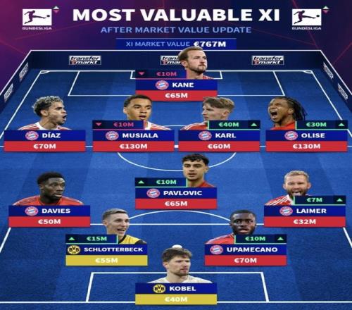 最近德国转会市场发布了“德甲身价最高最佳阵容”,总身价7.67亿欧元。凯恩、穆西亚拉、奥利塞、迪亚斯这些前场名字放在一起,纸面确实很豪华。可阵容构成也很刺眼:除了科贝尔和施洛特贝克,其他几乎清一色来自拜仁慕尼黑,联赛最佳阵容看起来更像拜仁的一套班底。这样的集中度,德甲冠军还有悬念吗?