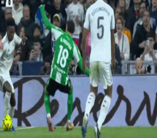 比赛的第5分钟,维尼修斯突入禁区左肋,在两名贝蒂斯球员的夹击下倒地,主裁判并未判罚点球。随后,视频助理裁判介入判罚,最终确认奥尔蒂斯并未犯规。