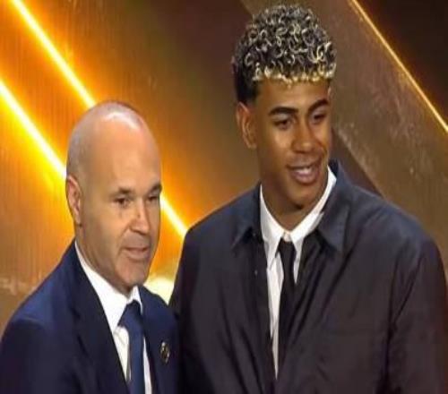 颁奖典礼上,亚马尔获得了2025年度西甲最佳U23球员奖,巴萨传奇伊涅斯塔亲自为亚马尔颁发了奖杯。