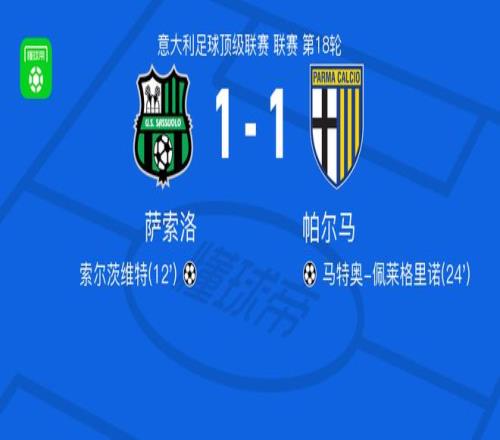 北京时间1月3日意大利足球顶级联赛 联赛 第18轮,萨索洛主场对阵帕尔马。萨索洛索尔茨维特破门。帕尔马马特奥-佩莱格里诺破门。最终比分萨索洛 1-1 帕尔马。