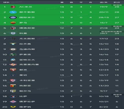 意甲第13轮结束了9场比赛,最新积分榜如下!