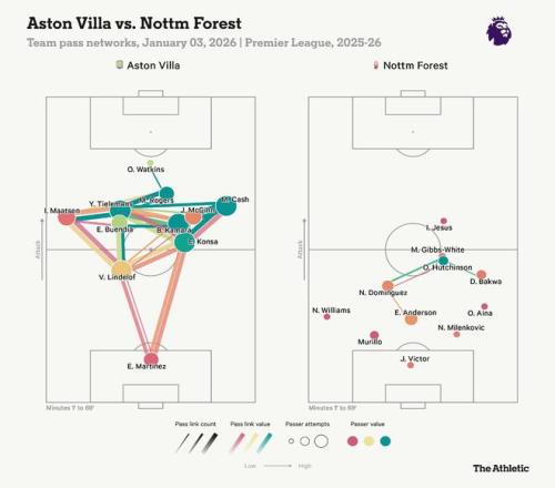 维拉压缩了对手的活动空间,尤其通过埃兹里-孔萨、约翰-麦金、布巴卡尔-卡马拉和尤里-蒂勒曼斯等人,持续地重新组织进攻。他们的每一名中场球员都表现出色。虽然麦金梅开二度可能成为今日头条,但蒂勒曼斯掌控比赛的能力,体现在他全场107次传球的数据上——这是本场比赛森林队传球最多球员(埃利奥特-安德森,32次)的三倍有余。