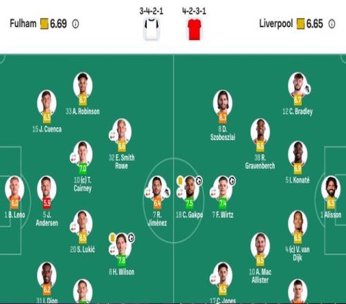 富勒姆首发:1-莱诺、31-迪奥普、5-安德森、15-昆卡、21-卡斯塔涅、20-卢基奇(92'6-里德)、10-凯尔尼(74'16-贝格)、33-罗宾逊、8-威尔逊(85'11-阿达玛-特劳雷)、32-史密斯-罗(74'22-凯文)、7-劳尔-希门尼斯(85'18-阿萨雷)