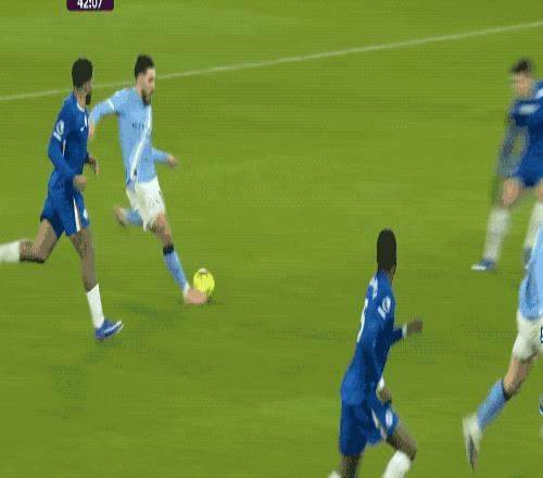 第42分钟,谢尔基准备直塞给哈兰德,皮球被巴迪亚希勒拦截后到了赖因德斯的脚下,赖因德斯连续假动作闪出角度,爆射死角,曼城取得领先。
