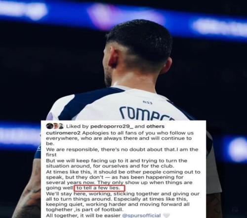 罗梅罗并非唯一表达不满的热刺球员。两名队友在帖子下留言支持。他的防线搭档波罗写道:“阿门。继续战斗,兄弟。我们还有很多仗要打。”前锋理查利森则留下了一个双手合十的表情符号,显然也认同这番话。