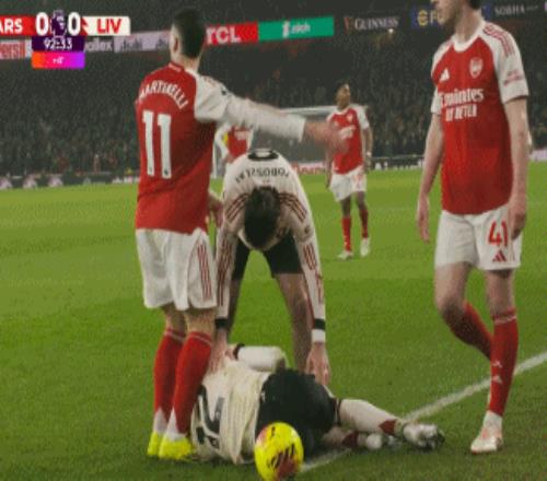 而或许是认为对手假装受伤,又或许是想急于取胜,阿森纳前锋马丁内利不仅没有上前表示关切,反而拿着球狠狠砸了倒在地上痛苦不已的布拉德利身上,马丁内利的这一行为让双方燃起火药味。