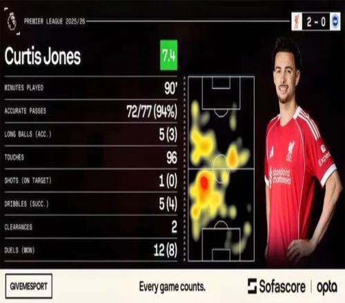 与赫拉芬贝赫坐镇中场三区,琼斯既具侵略性又富创造力。他对待皮球小心翼翼,77次传球成功72次,传球成功率高达94%,确保利物浦从第1分钟到第90分钟都掌控着比赛节奏。他5次尝试盘带成功4次,仅被布莱顿球员抢断1次;防守数据方面——2次铲断、2次解围、2次回收球权——只是他近乎完美表现的冰山一角。
