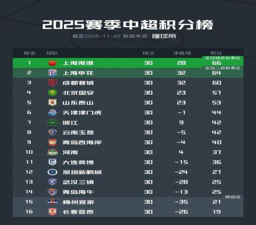 北京时间11月22日,2025赛季中超联赛迎来大结局。最终,上海海港夺冠,长春亚泰和梅州客家降级。