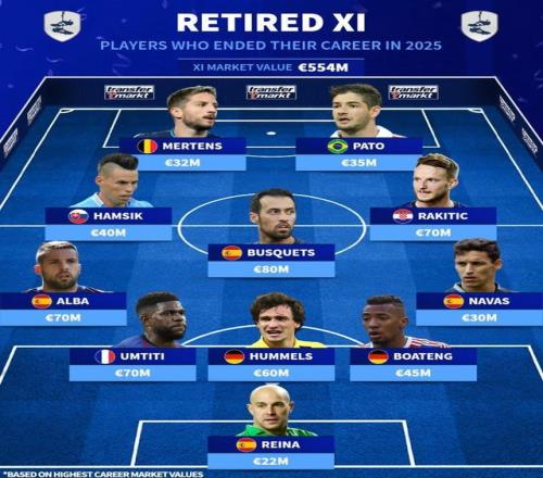 德转列2025年退役球员最佳11人(括号内为生涯德转最高身价):